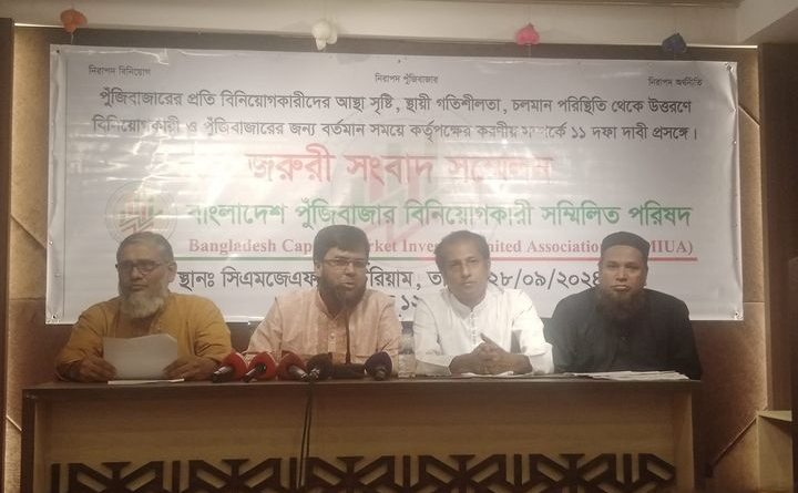 শনিবার (২৮ সেপ্টেম্বর) এক সংবাদ সম্মেলনে ‘বাংলাদেশ পুঁজিবাজার বিনিয়োগকারী সম্মিলিত পরিষদ’ এর ব্যানারে এই দাবি জানানো হয়েছে।