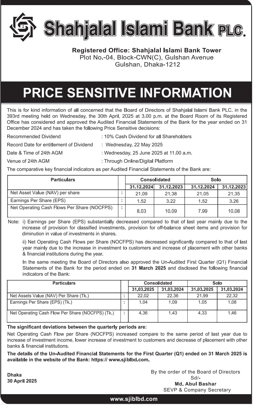প্রাইস সেনসিটিভ ইনফর্মেশন শাহজালাল ইসলামী ব্যাংকের লভ্যাংশ ঘোষণা admin এপ্রিল ২৯, ২০২৫এপ্রিল ৩০, ২০২৫